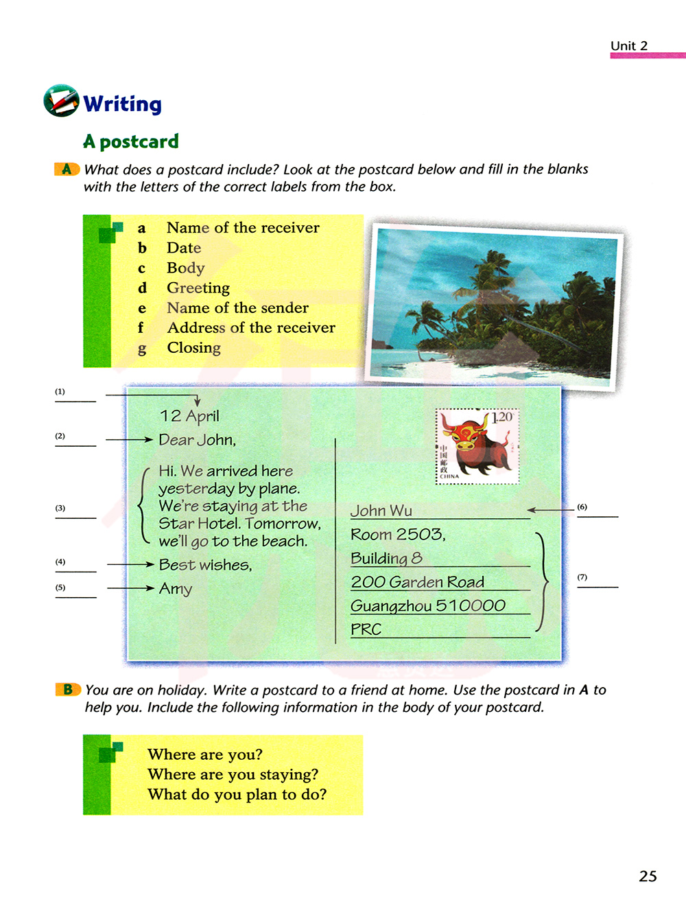 一张明信片包含些什么?看下面这张明信片,在方框中找出正确的标注并把对应的字母填在空白处。