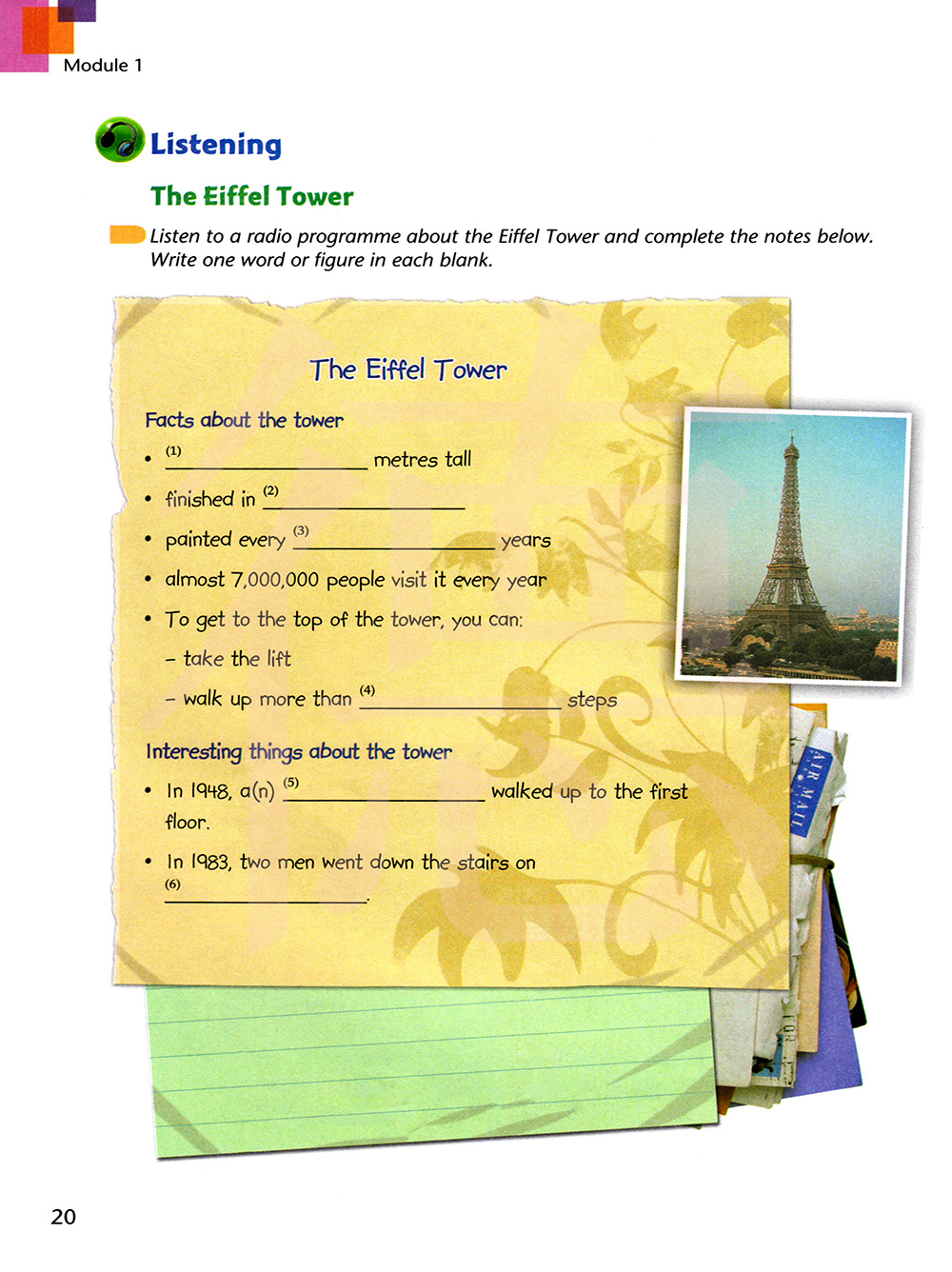 听一个关于埃菲尔铁塔的电台节目并完成下面的笔记。在每个空白处写上一个单词或数字。