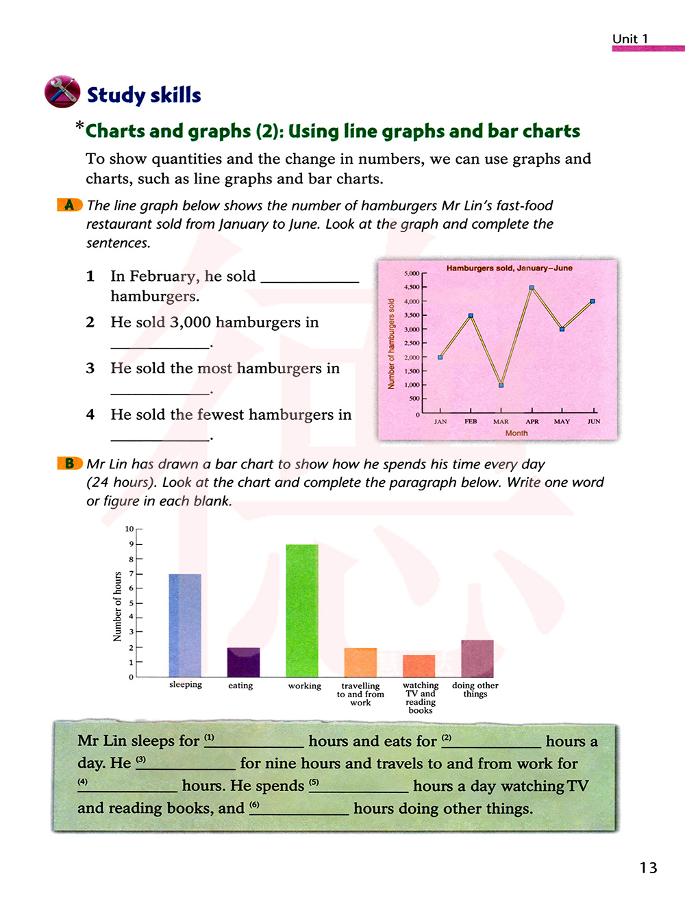 李先生画了一个柱形图来表示他每天的时间分配。看这个图表并完成下面的文章。在每个空白处写上一个单词或数字。