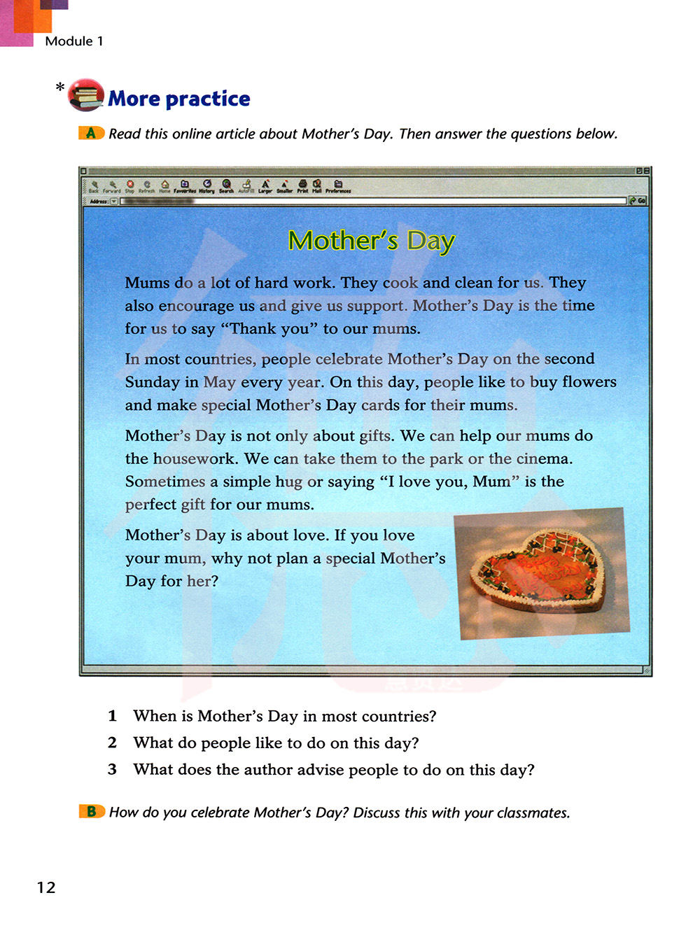你是如何庆祝母亲节的?和你的同学讨论一下。