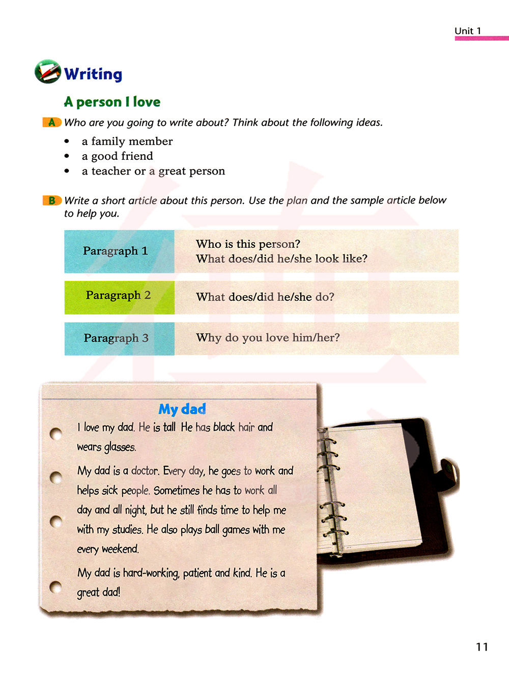 我爱我的爸爸。他身材高大。他有黑头发,戴着眼镜。