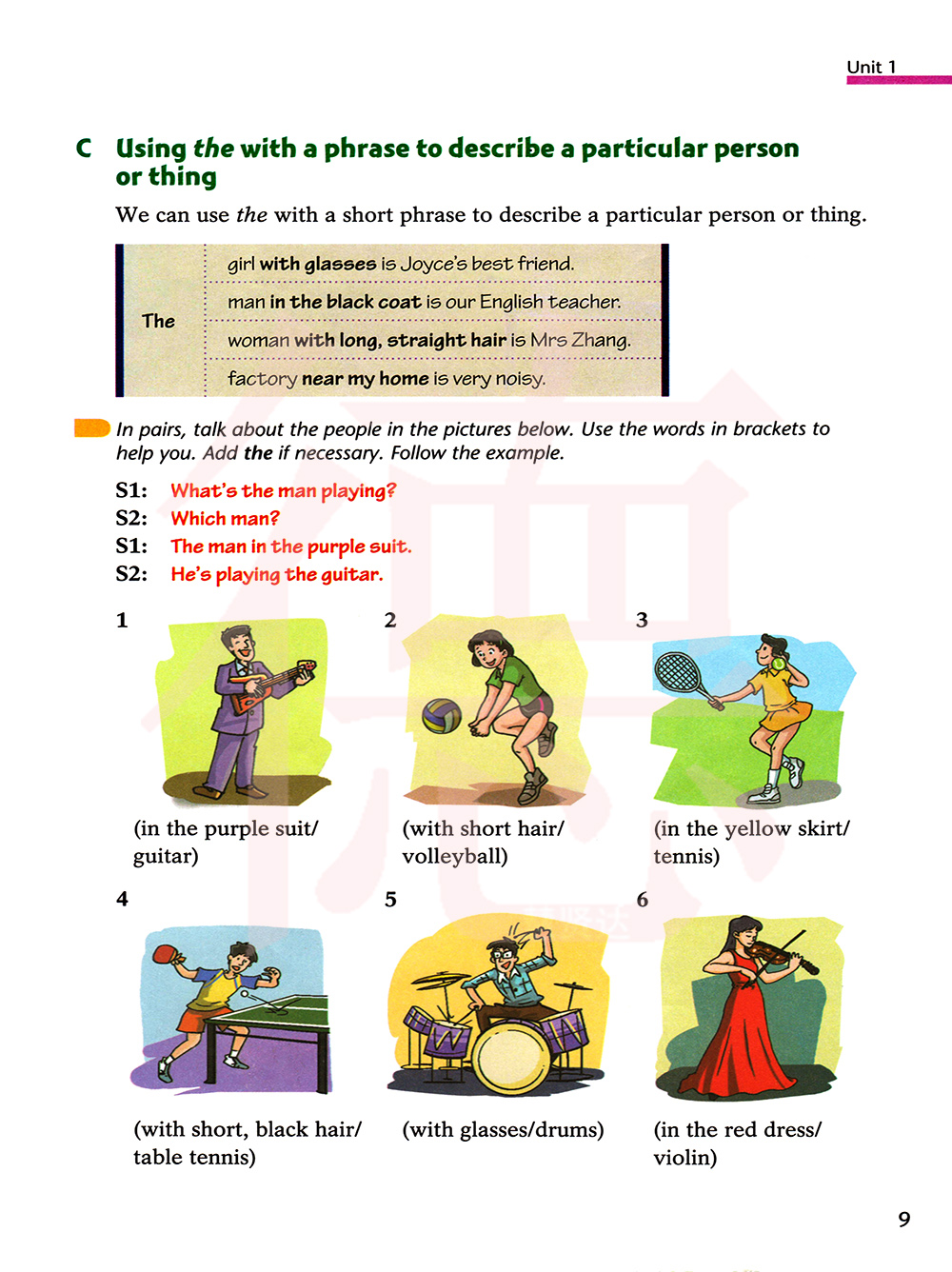 两人一组,说说下面图片中的人物。用括号内的单词帮助你。必要时加the ,仿照例句。