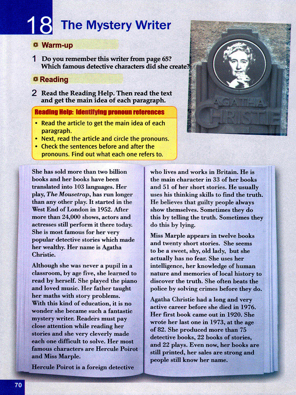 她已经卖出了20多亿本书,她的书已经被翻译成103册。她的剧本《捕鼠器》比其他任何剧本都要长。1952年,它开始于伦敦西区。在两万四千多场演出之后,男女演员仍然在那里表演。她最出名的是她的侦探小说,这些小说使她变得富有。她叫阿加莎·赫里斯蒂。