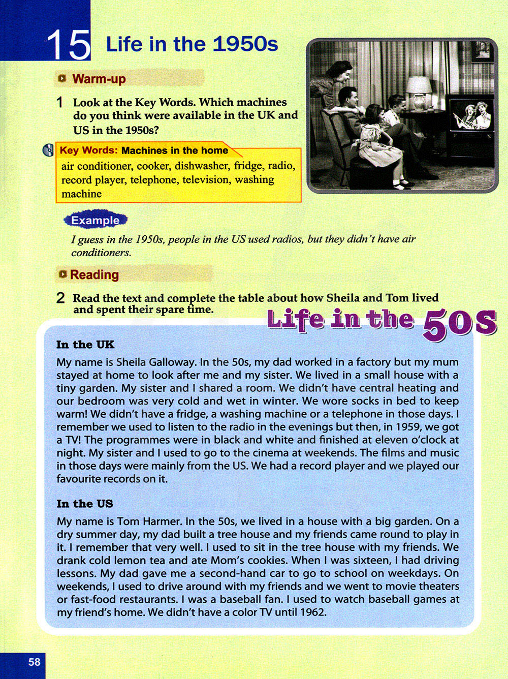 我叫希拉·加洛韦。在50年代,我爸爸在一家工厂工作,但是我妈妈呆在家里照顾我和我妹妹。我们住在一个带小花园的小房子里。我和妹妹合住一个房间。我们没有暖气,冬天卧室又冷又湿。我们在床上穿袜子保暖!我们没有冰箱,没有洗衣机,也没有电话。我记得我们过去常在晚上听收音机,但后来,在1959年,我们有了电视!所有的节目都是黑白的,十一点就结束了。我妹妹和我过去常在周末去看电影。这些电影和音乐主要来自美国。我