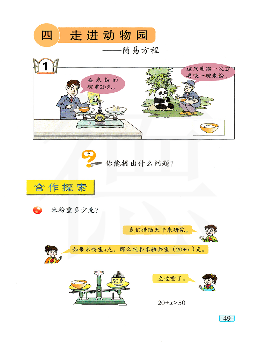 学习目标: 知识与技能:巩固解方程的方法,规范解方程的格式和写法,进一步提高学生分析、迁移的能力。 过程与方法:经历解方程的过程,熟练掌握解方程的方法。 情感、态度与价值观:在学习活动中,激发学生的学习兴趣,体验学习的成功和快乐。 重点:掌握解方程的方法和书写格式。 难点:灵活运用知识解决问题。