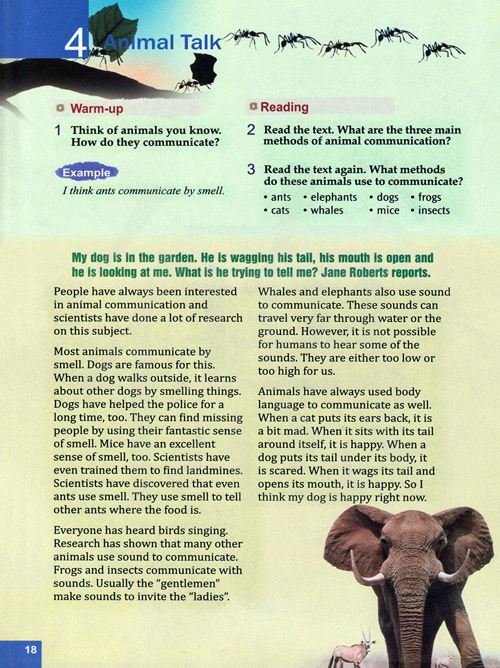 大多数动物通过嗅觉交流。狗就是因为这个而出名的。当狗在外面散步时,它通过闻东西来了解其他狗。很长一段时间以来,狗也帮助警察。他们可以用他们奇妙的嗅觉找到失踪的人。老鼠也有很好的嗅觉。科学家甚至训练他们寻找地雷。科学家发现,甚至蚂蚁也有嗅觉。它们用气味告诉蚂蚁食物在哪里。