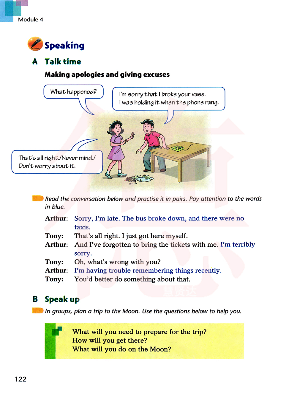 读下面的对话,然后两人一组进行练习。留意蓝色的单词。