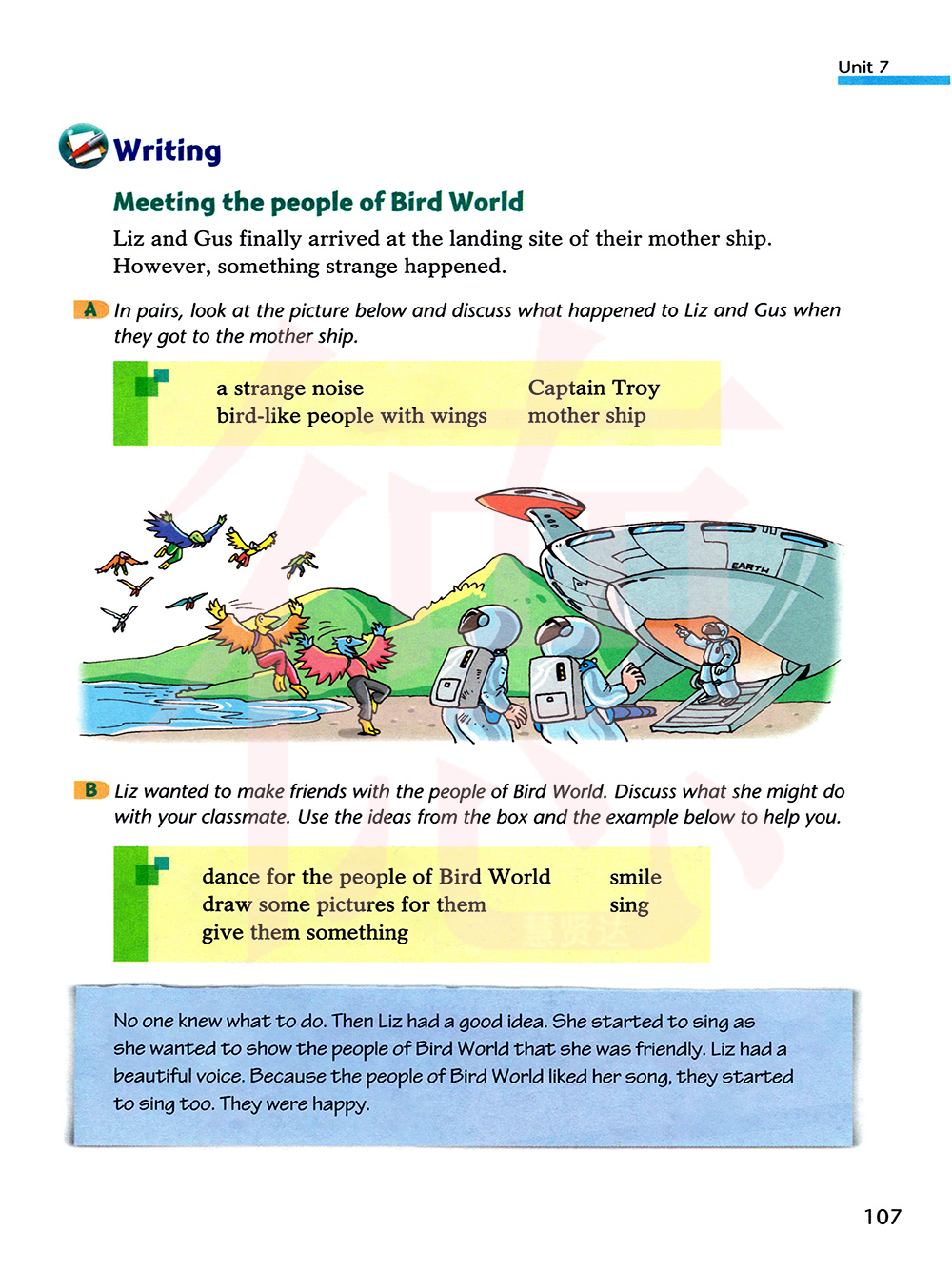 利兹像和鸟界的人们成为朋友。和同学讨论他可能做什么。用方框中的想法和下面的例子帮助你。