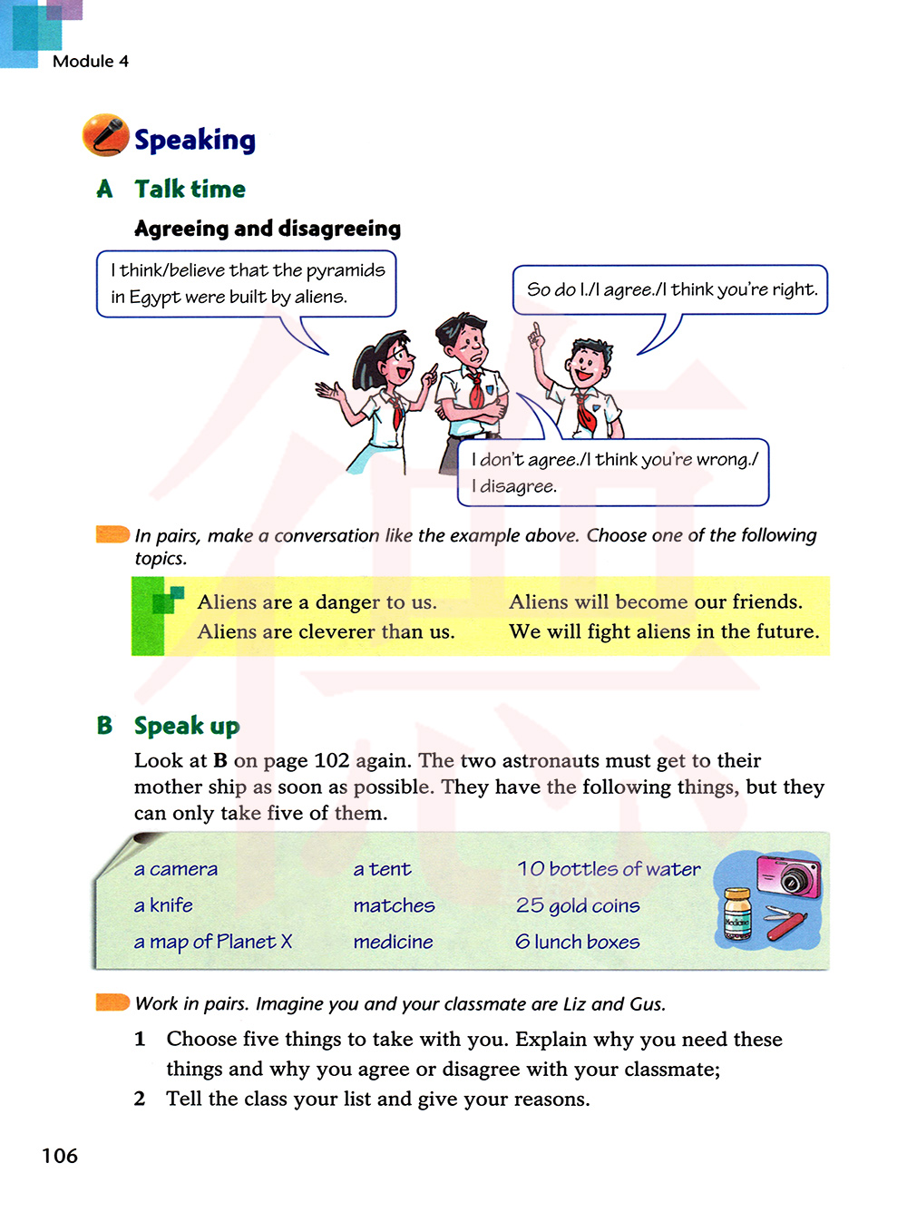 再看一次102页B的内容。这两名宇航员必须尽快返回它们的主飞船里。他们有下列这些物品,但是他们只能带上其中的五种。