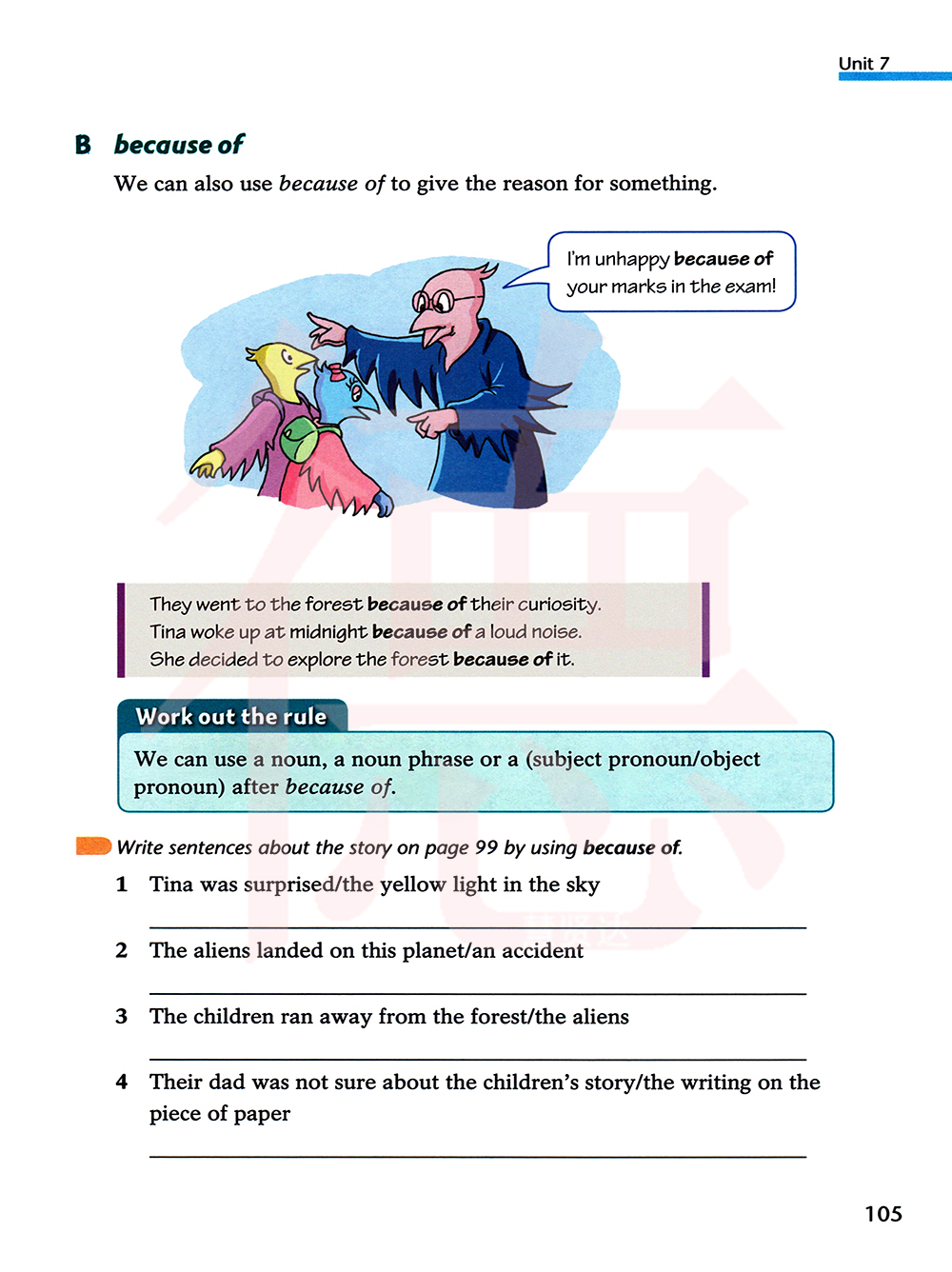 用because of 写一写关于99页的故事的句子。