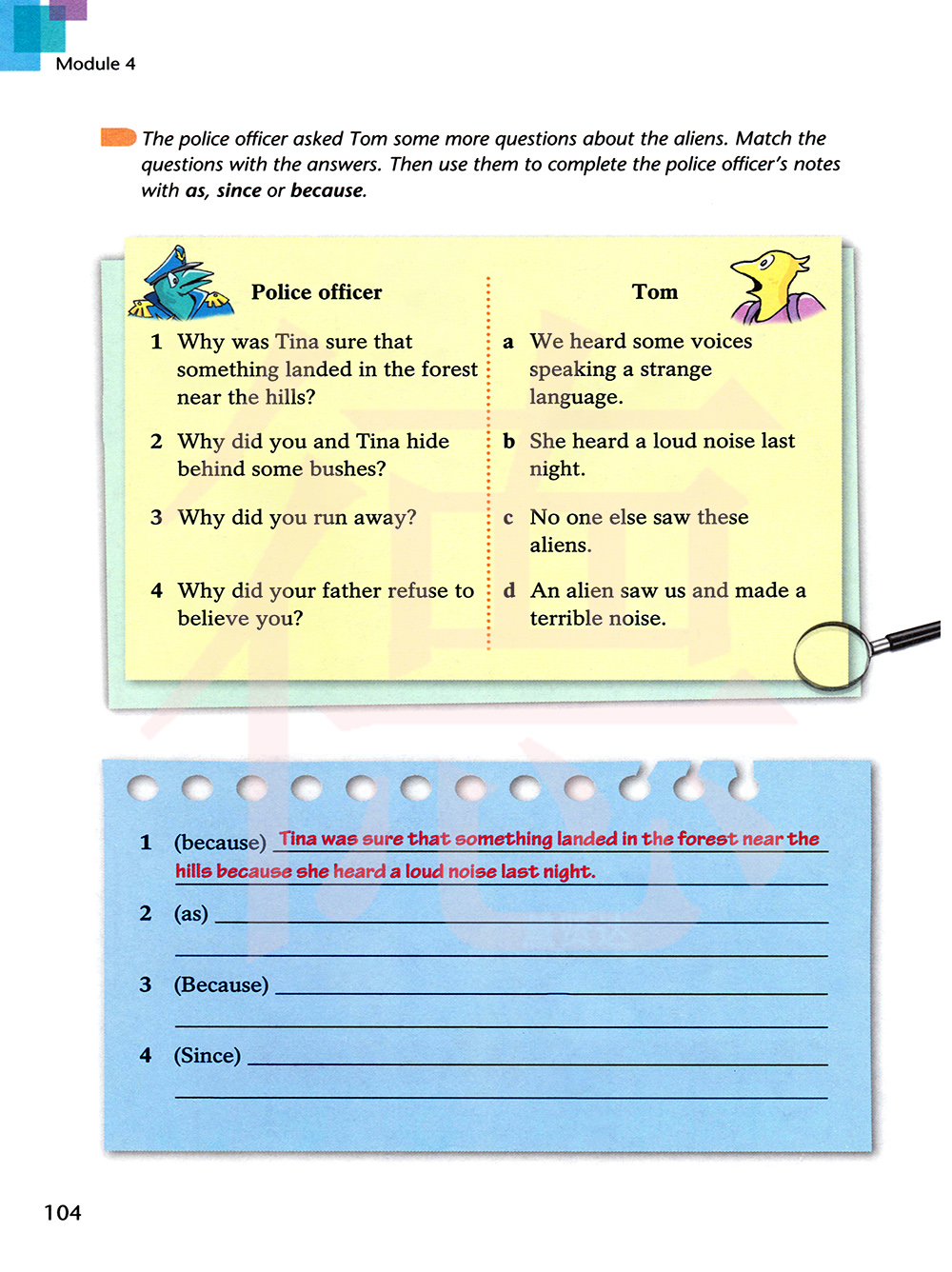 警官问了汤姆更多关于外星人的问题。把问题和答案搭配起来。然后用as,since或because把以上问题和答案连起来以完成警官的笔记。