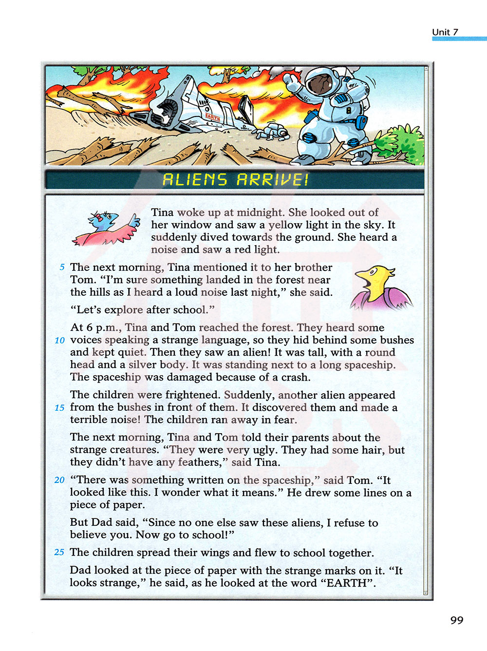 下午 6 点,蒂姆和 汤姆来到了森林。他们听到说着一种奇怪的语言的声音,于是他们屏信呼吸躲在灌木丛后面。然后,他们看到了一个外星人!它身材高大,有圆圆的头和一个银色身体。它站在一个长长的飞船旁边,该飞船因为撞击损坏了。