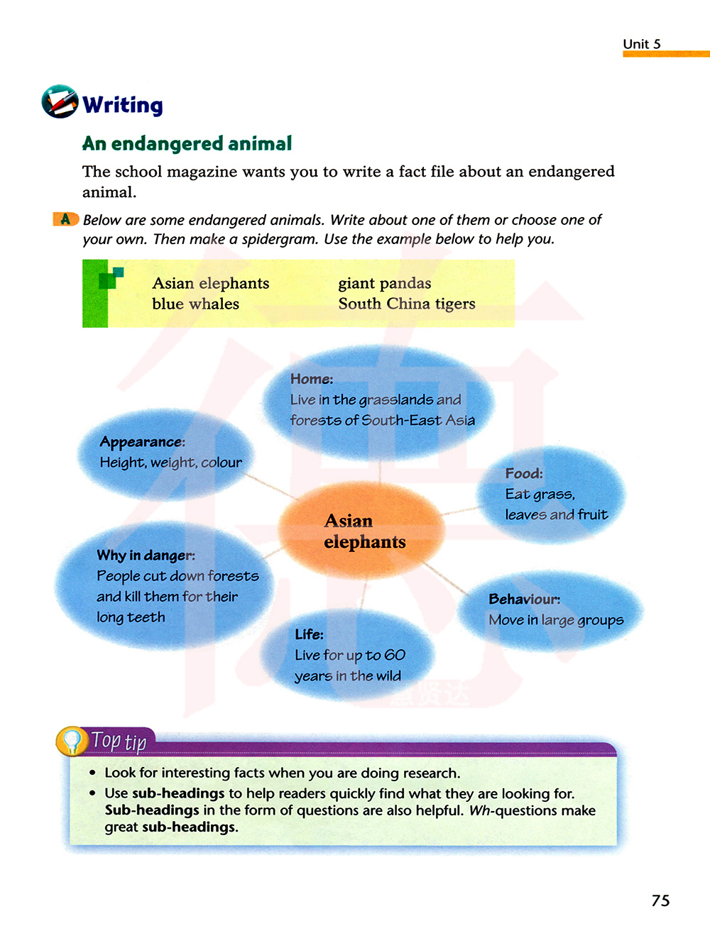 下面是一些濒危动物,选下面其中的一种或者自选一种来写。然后制作一种蛛形图。用下面的例子帮助你。
