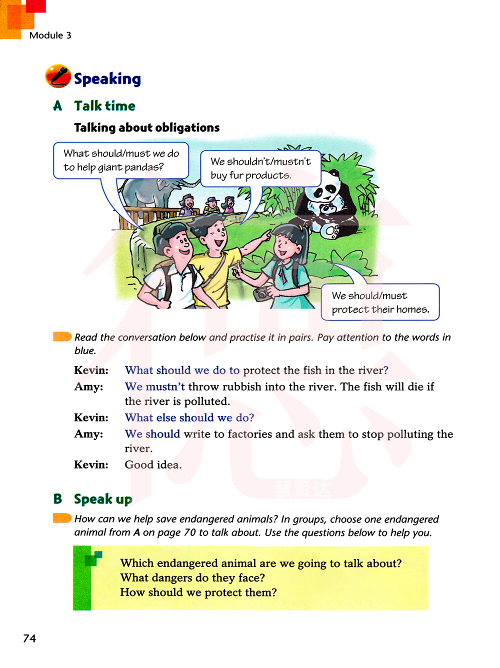 我们可以怎样帮助拯救濒临动物。以小组为单位,在第70页的练习A中选一种濒临动物进行讨论。用下面的问题来帮助你。