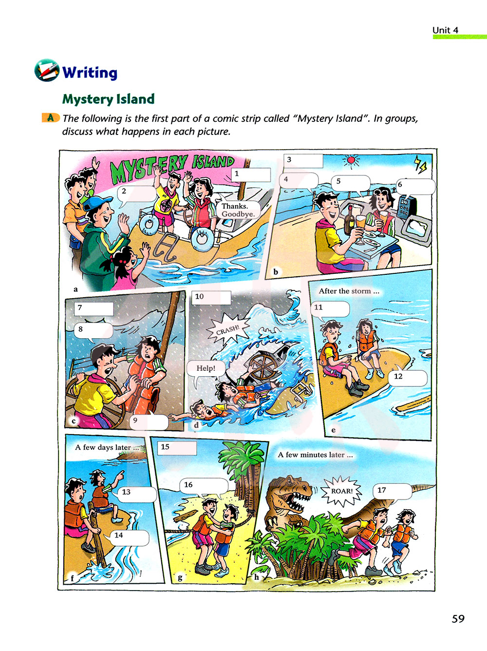 下面是连环漫画《神秘岛》的第一部分。以小组为单位,讨论每一幅图发生的事情。