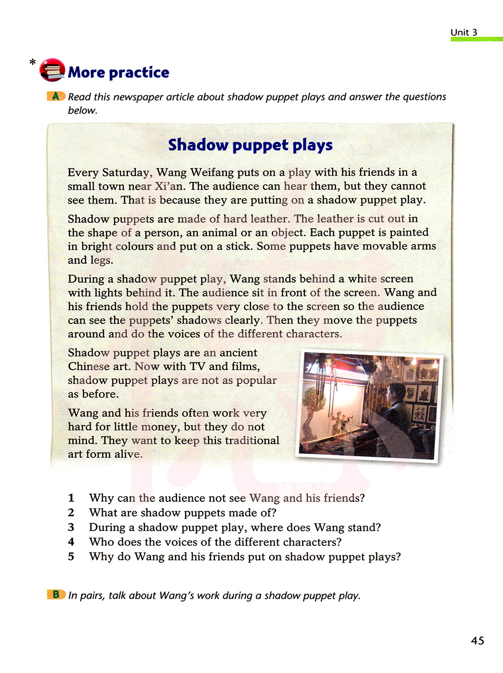 读这篇关于皮影戏的报纸文章并回答下列问题。