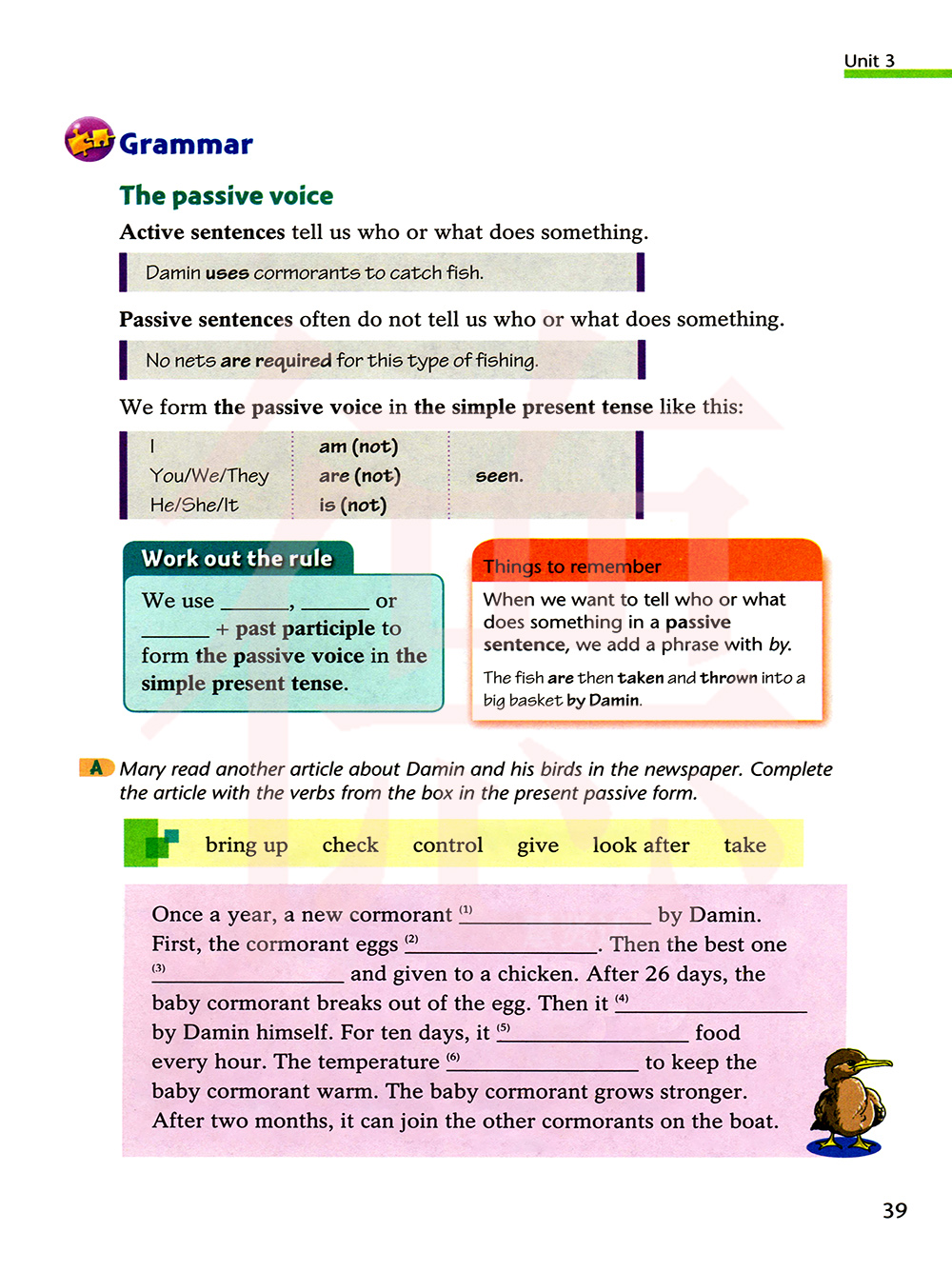 玛丽在报纸上读了另外一篇关于大民和他的鸟的文章。用方框里动词的现在时的被动语态完成这篇文章。