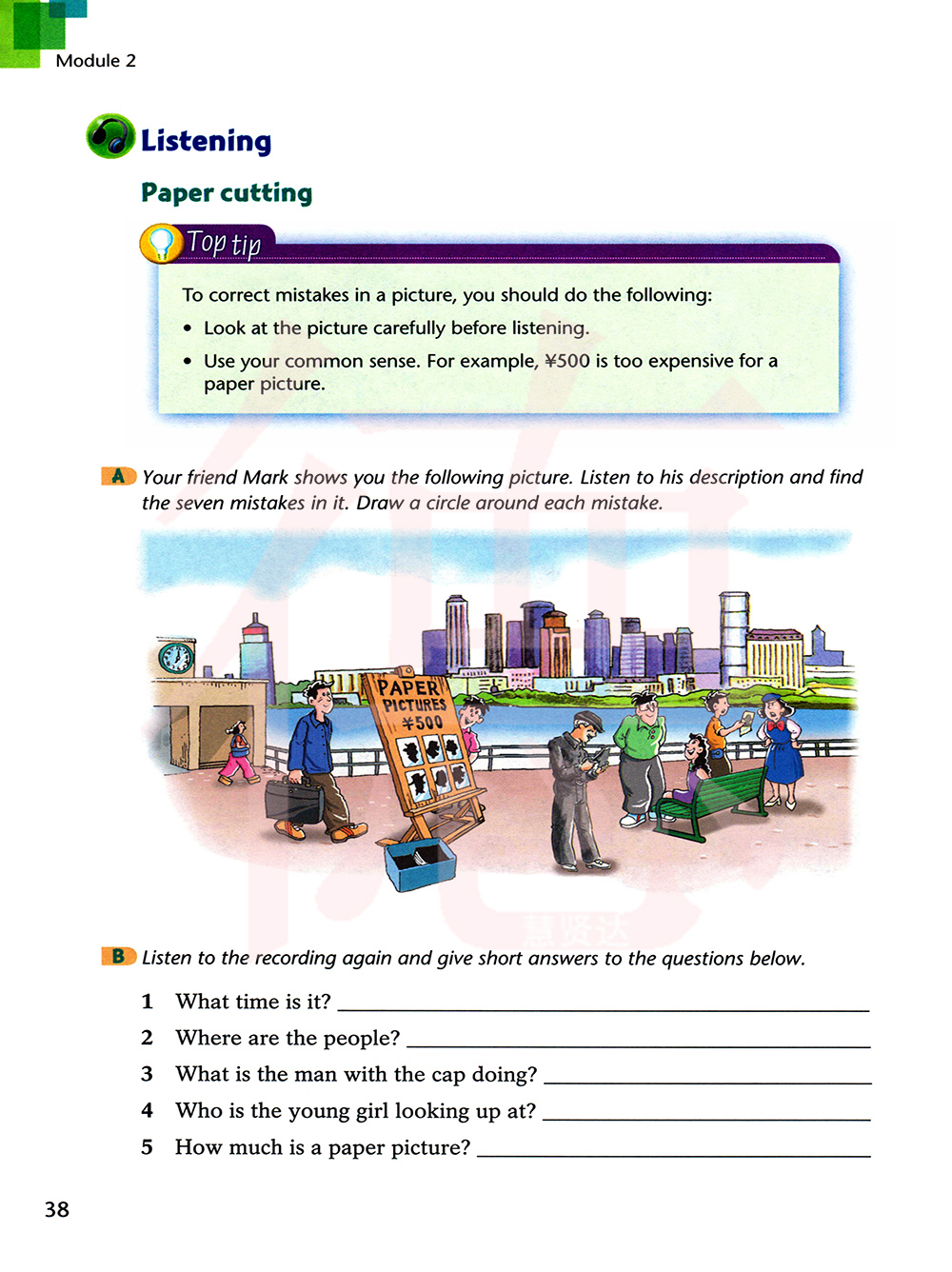 你的朋友马克给你看了下面这张图片。听他的描述并找出里面的七处错误,在每一处错误的周围画一个圈。