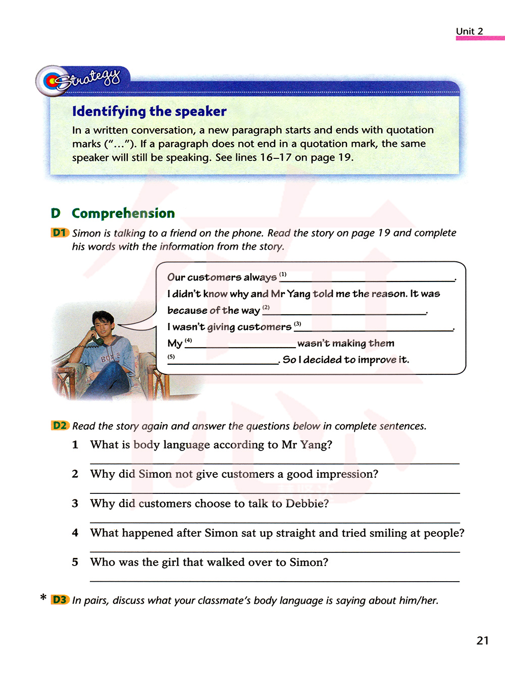 西蒙在和一个朋友聊电话。读第19页的故事并用故事里的信息完成他说的话。