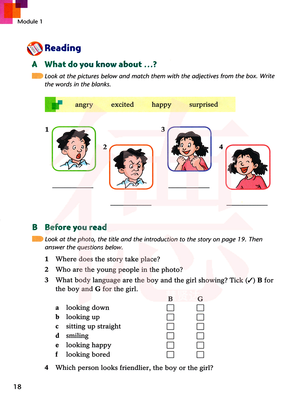 男孩和女孩表现出什么肢体语言?属于南海的肢体语言在B下面打勾,属于女孩的在G下面打勾。
