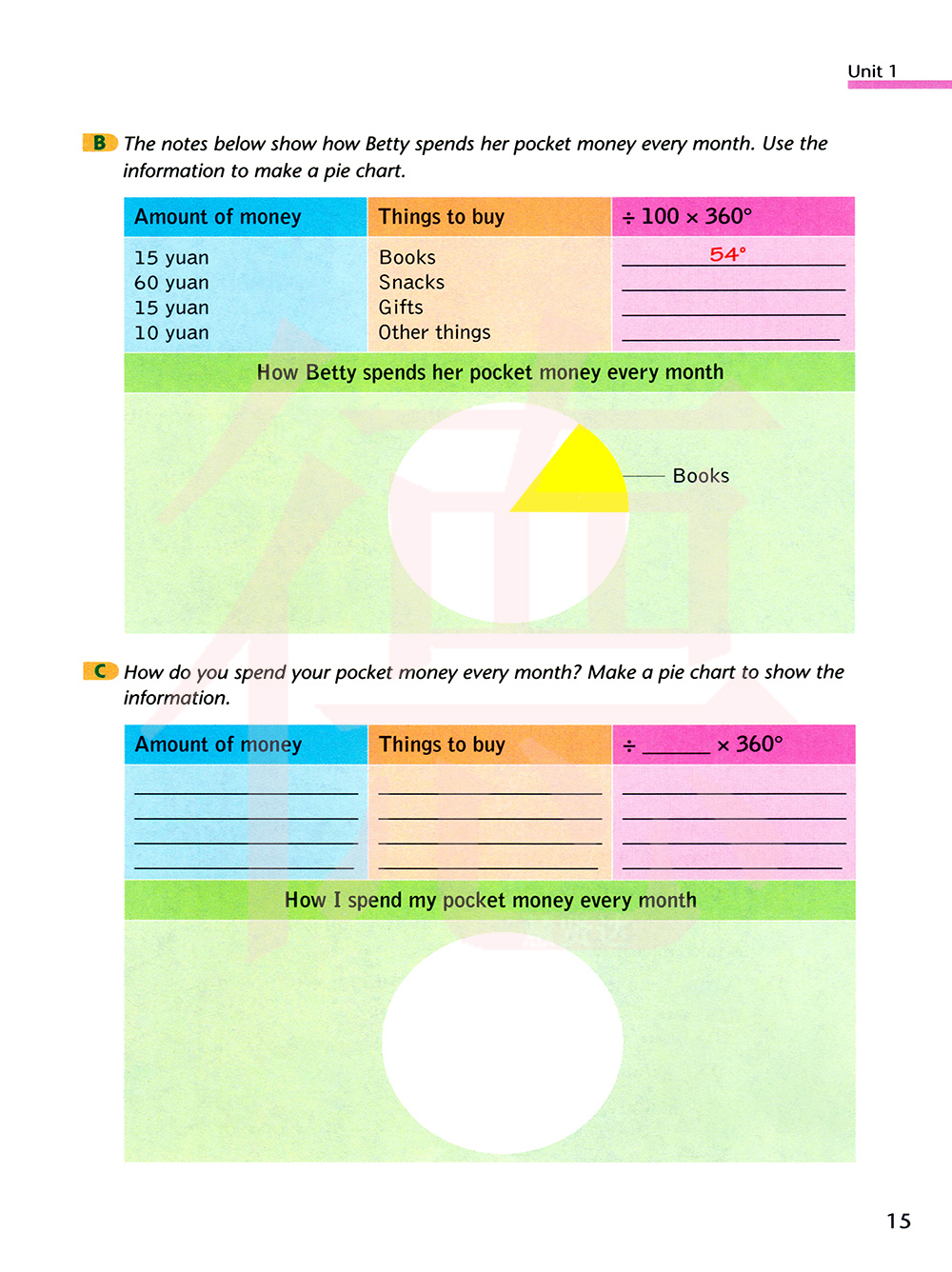 下面这些笔记表明了贝蒂怎样花费他每月的零花钱。使用这些信息制作一个饼状图。