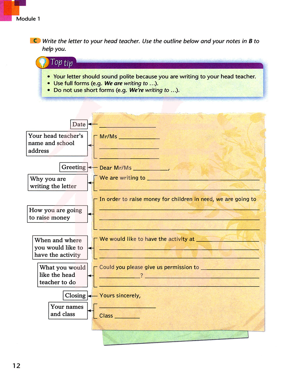给你的校长写一封信,用下面的提纲和你在B中的笔记作为参考。