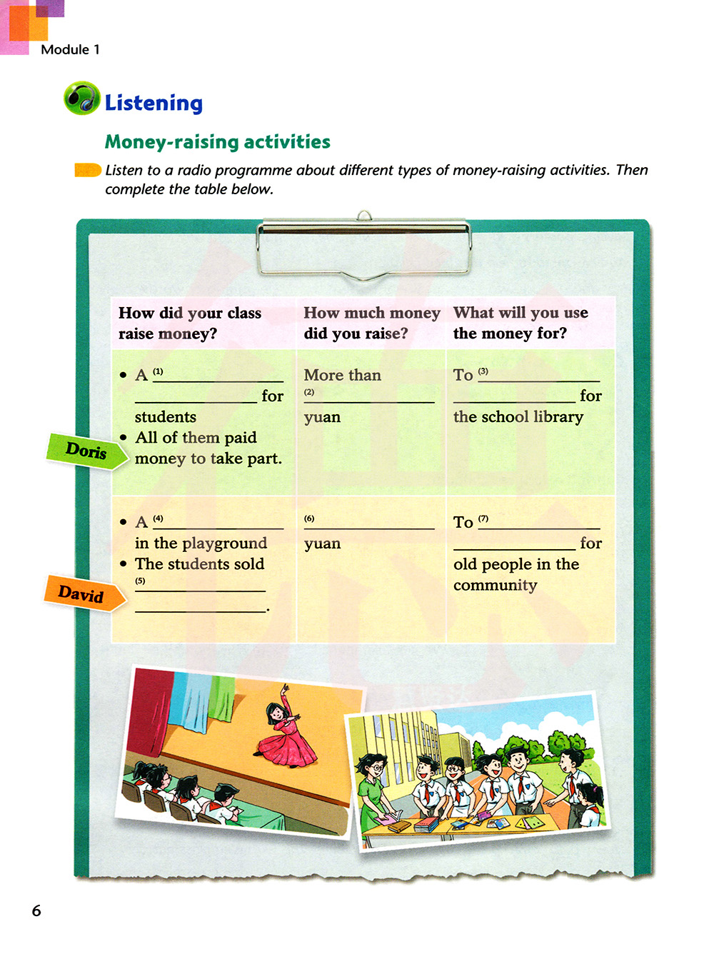 听关于不同种类的筹款活动的一个电台节目。然后完成下面的表格。
