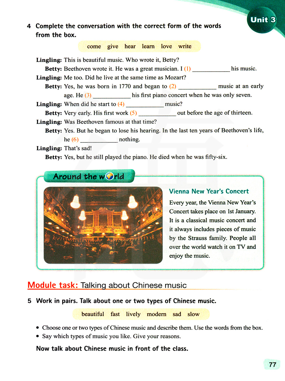 选一种或两种中国音乐并描述它们,使用方框中的单词。说一说你最喜欢哪种类型食物音乐。给出理由。