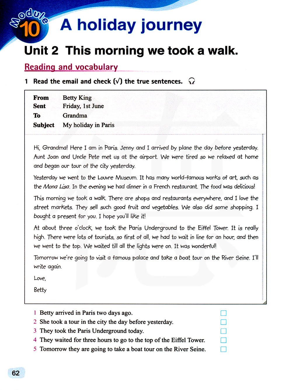 你好,奶奶。我现在在巴黎,珍妮和我前天乘飞机到达,琼阿姨和皮特叔叔在机场接我们,我们累了,所以我们在家放松,昨天开始了我们的巴黎之旅。
