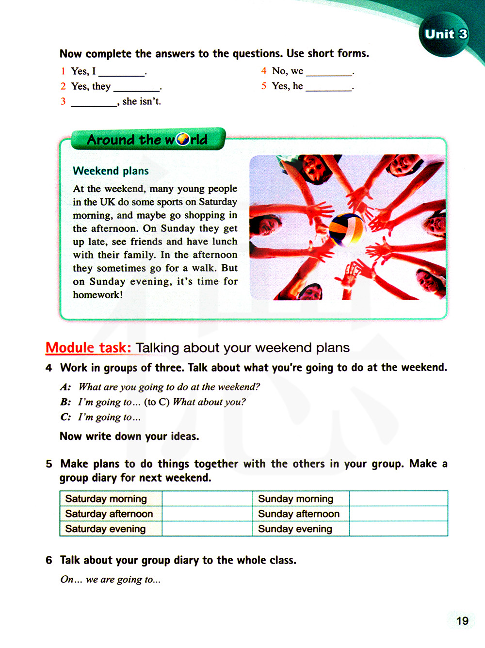 和你们小组中其他成员一起制定计划。写一写下个周末的小组日记。