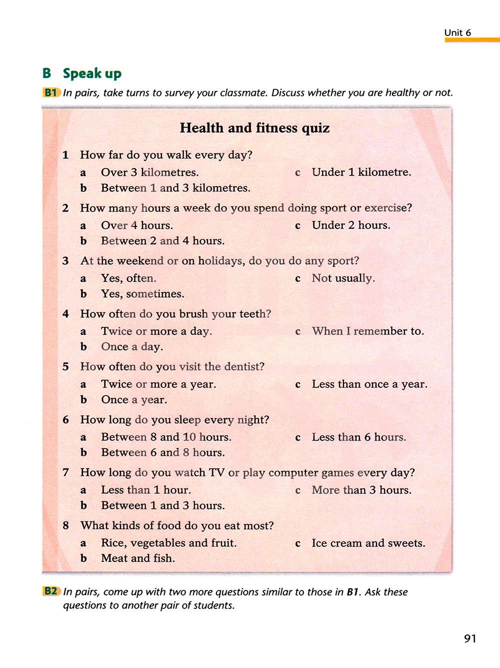 两人一组,轮流一组调查你的同学。讨论一下是否健康。