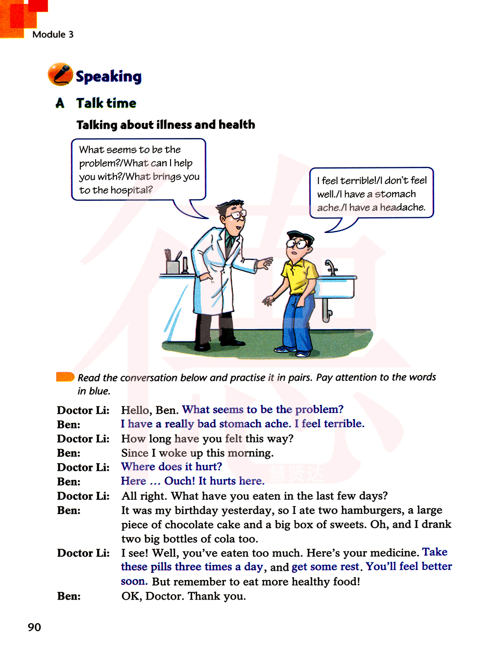 读下面的对话,然后两人一组进行练习。注意蓝色字体的词汇。