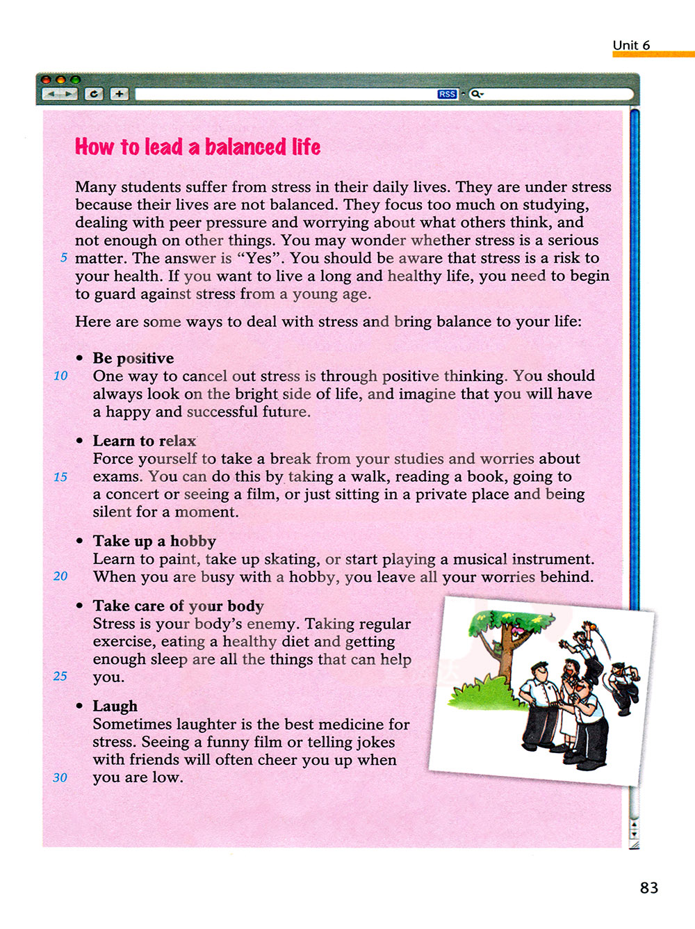 有时候,笑是疏解压力的最佳良药。当你心情低落时,看一部有趣的电影,或和朋友讲讲笑话往往会你振作起来。