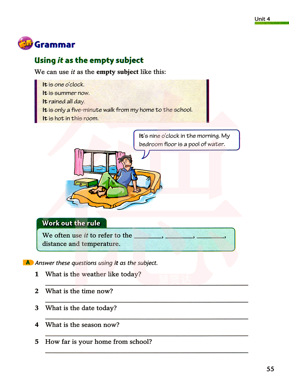用it做主语回答下面的问题。