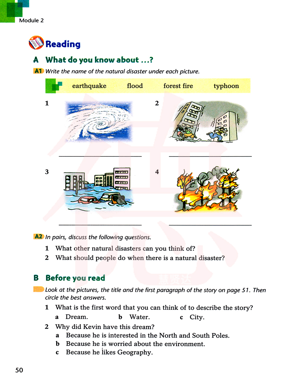 在每幅图片下方写下自然灾害的名称。