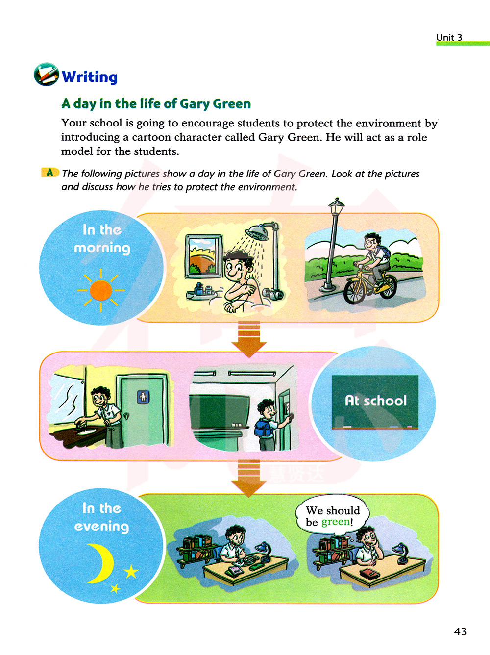下面的图片展示了盖里.格林一天的生活。看图片,讨论他是怎么样保护环境的。