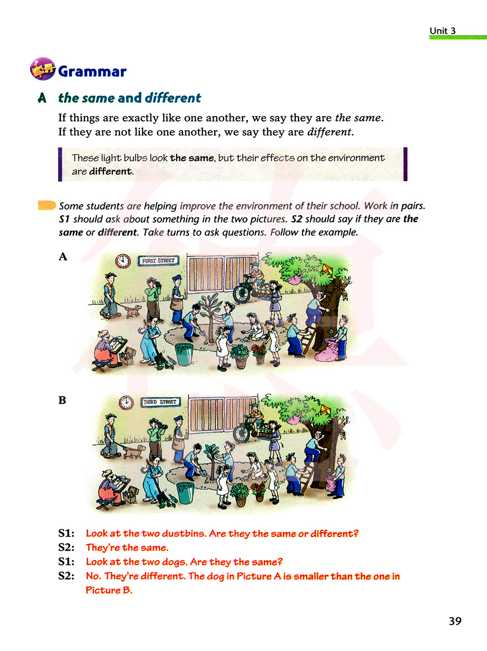 一些中学生正在帮忙改善他们学校的环境。两人一组。第一个学生要问一些两幅图中的事物。第二个学生要说他们是否相同。轮流提问。仿照例子。