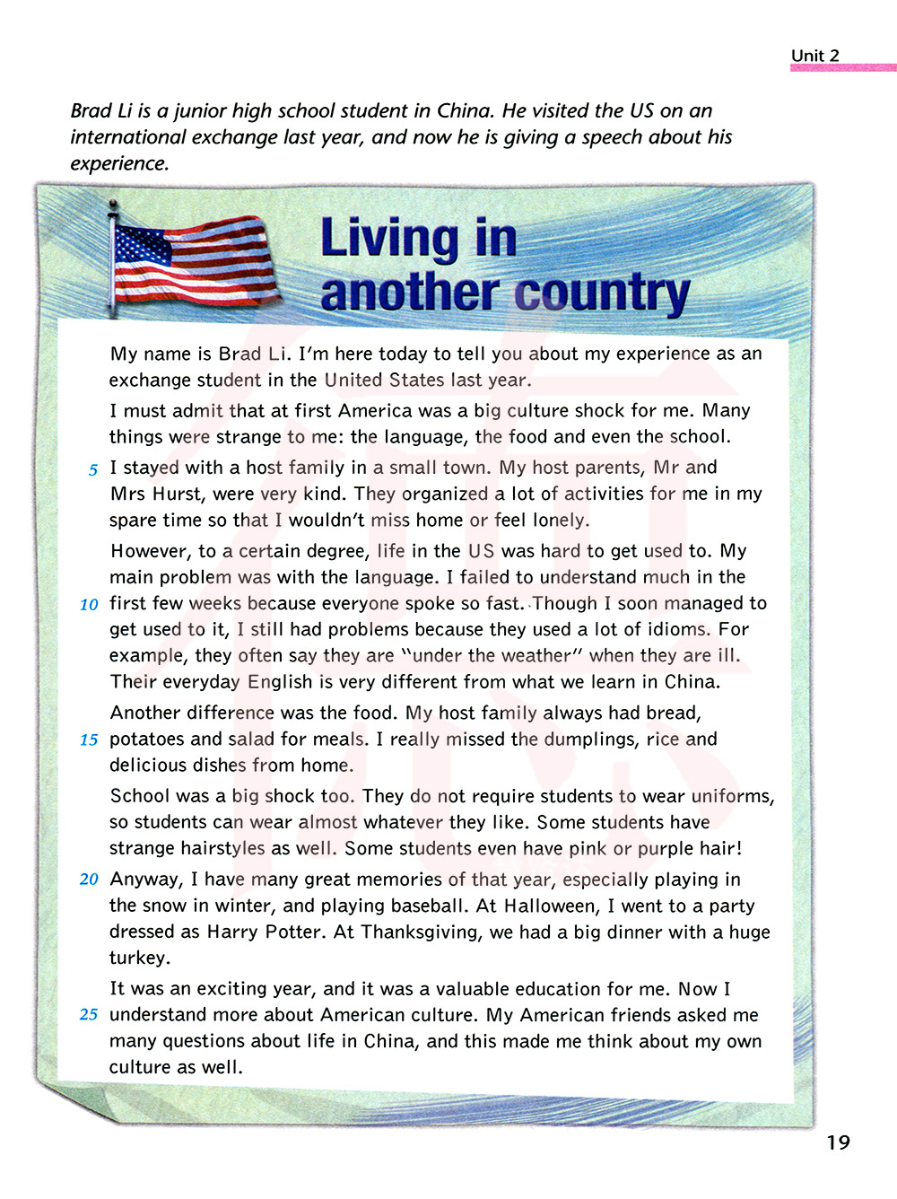 布拉德.李是一位中国初中生。他去年作为国际交换生去参观了美国,现在他就自己的经历做一个演讲。