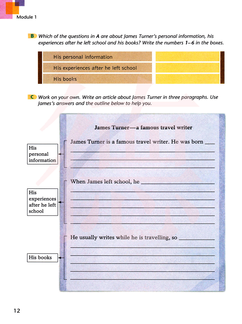 独立完成。写一篇三个段落的有关詹姆斯.特纳的信息。用詹姆斯的答案以及下面的提纲帮你。