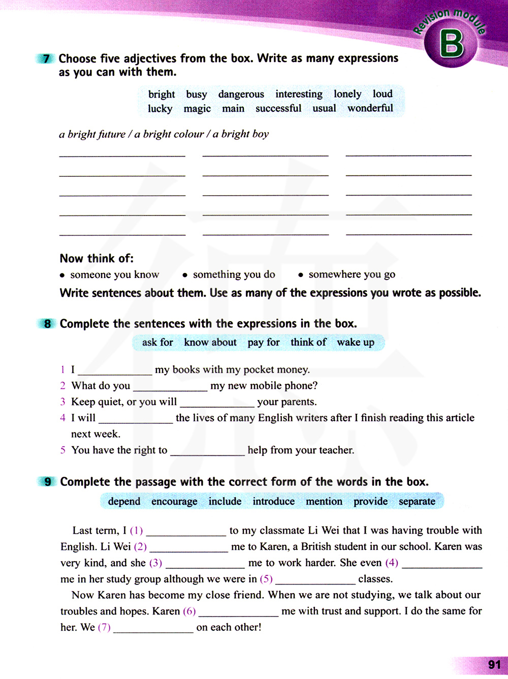 7 从方框里选出五个形容词。用它们写出尽可能多的短语。