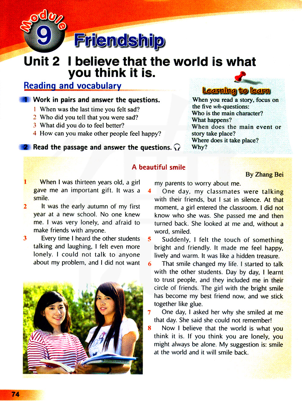 那个微笑改变了我的生活。我开始和其他学生一起讲话。日复一日。我学会了信任别人,他们也把我包括在他们的圈子里。那个笑容灿烂的女孩现在已经成为我最好的朋友,我们亲密无间。