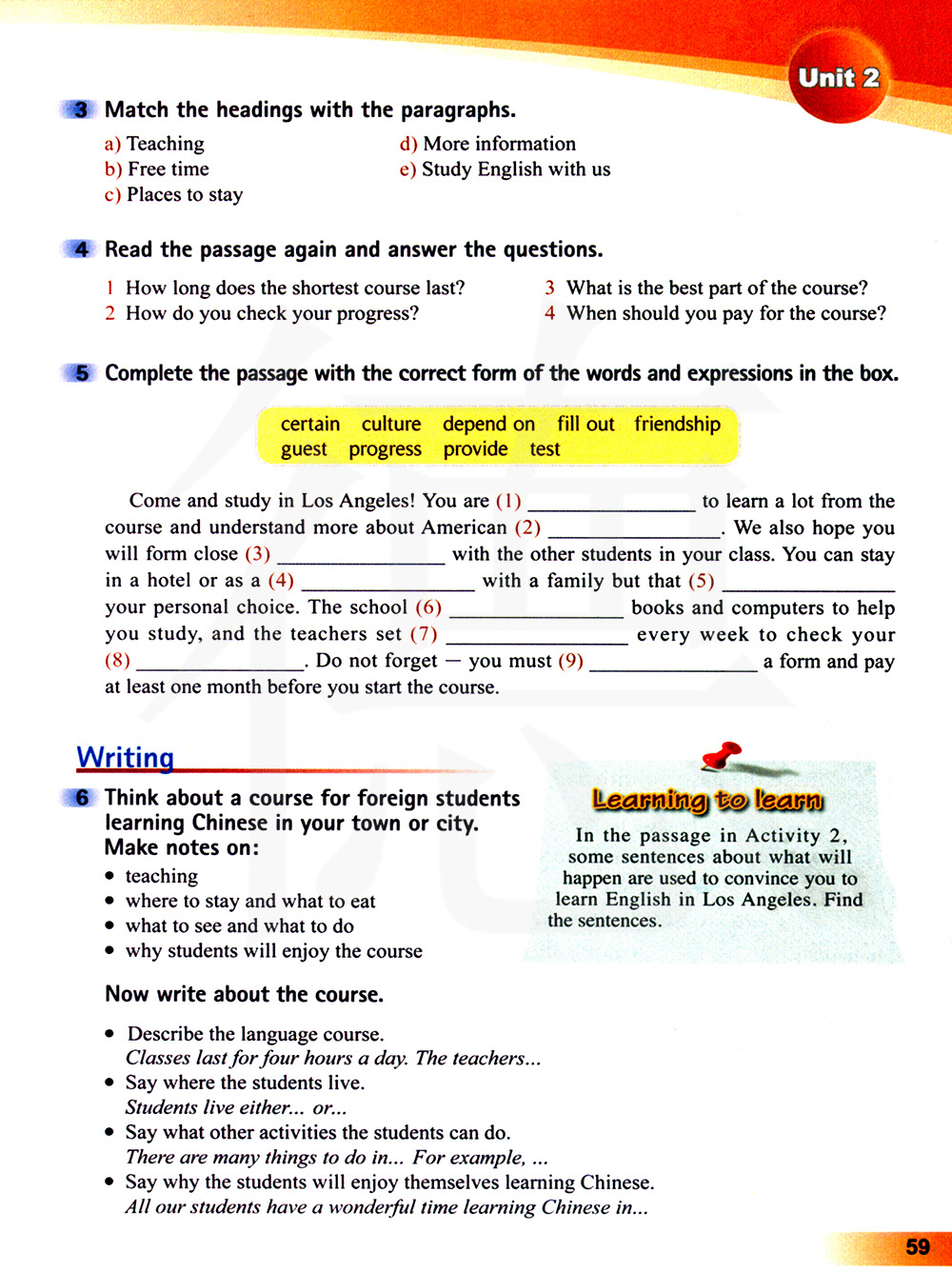 6 想一想关于外过学生到你所在的城镇或城市学习汉语的课程。在以下几个方面做笔记。