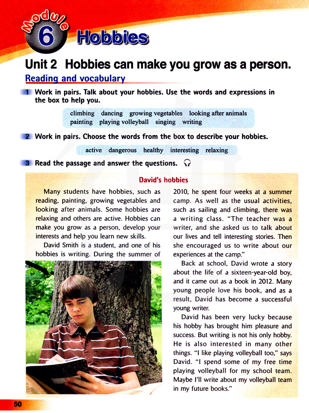 大卫一直很幸运,因为他的爱好给他带来了快乐和成功。但是写作不是他唯一的爱好。他还对许多其他事情感兴趣。“我也喜欢打排球,”大卫说。“我花了一些空闲时间为校队打排球,也许我会在未来的书中写我的排球队。”