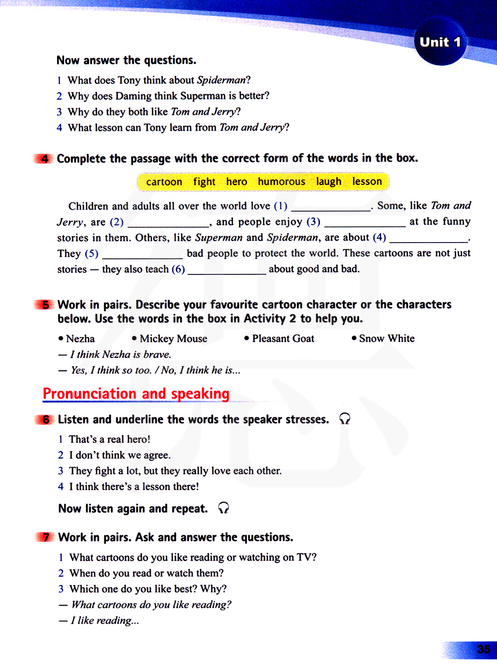 5 两人一组练习。描述你最喜欢的卡通人物或者下面的人物。使用活动2中方框里的单词来帮助你。