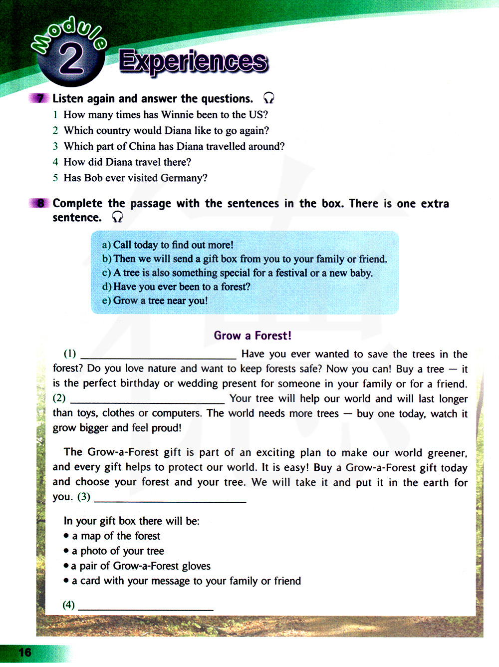 c)一棵树也是庆祝或者新生儿的特别的礼物。 d)你曾经去过森林吗?e)在你的附近种一棵树!