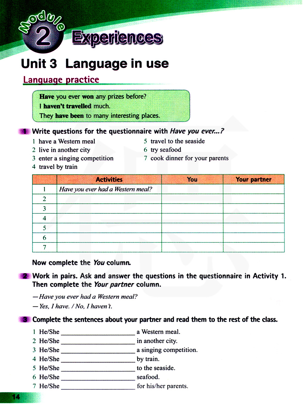 1 使用Have you ever……?为调查问卷设计问题。