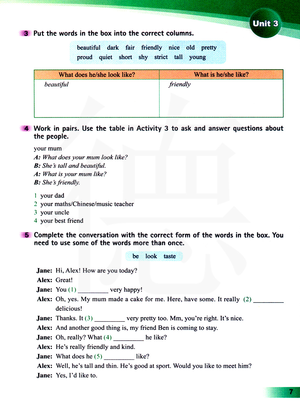 漂亮的 (皮肤,毛发等)棕黑色的 (头发)金色的,浅褐色的 友好的 友好的;好心的 老的 秀丽的;标志的 感到自豪的;感到骄傲的 安静的 矮的 害羞的 严厉的 高的 年轻的