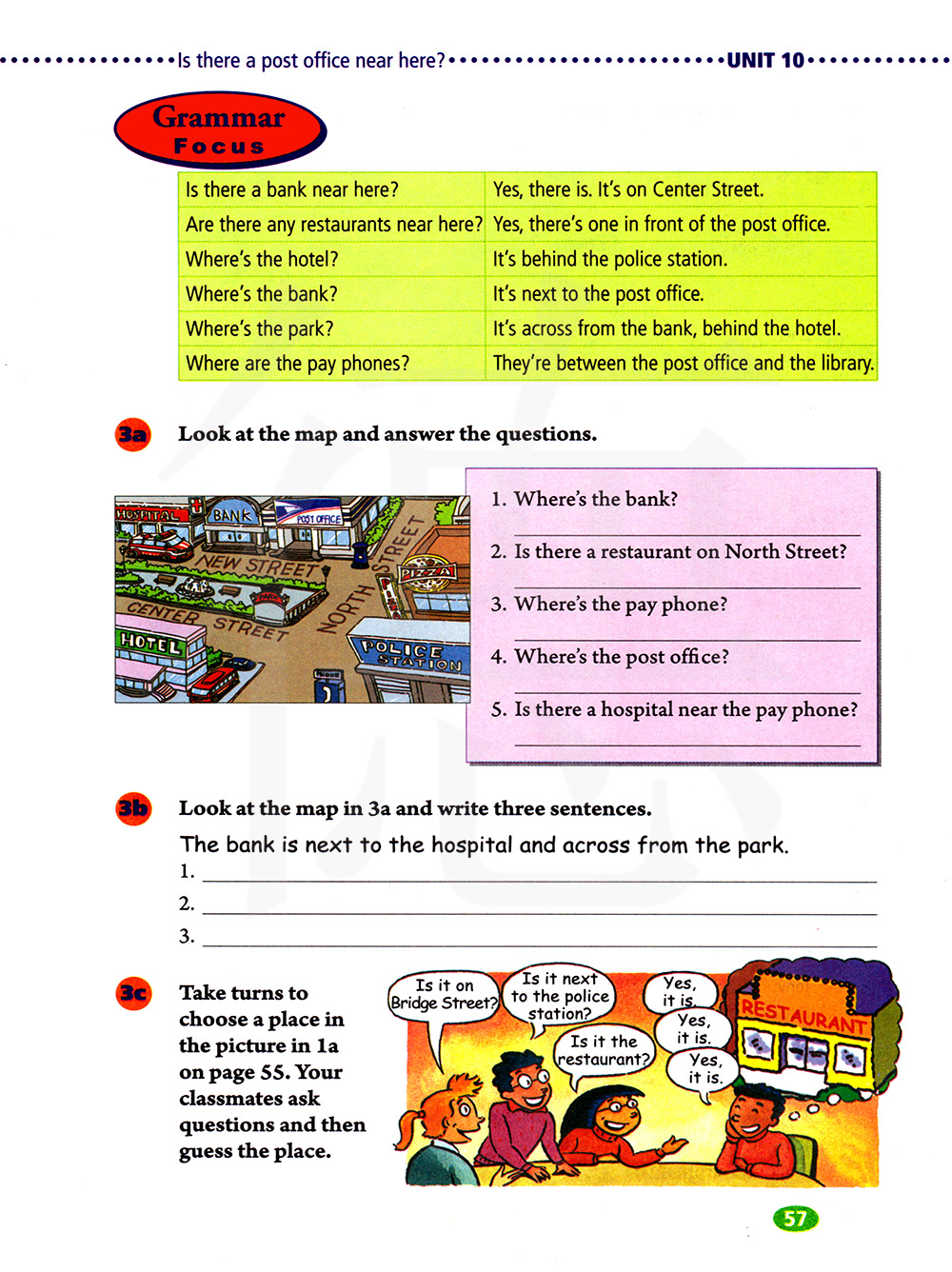 这附近有银行吗?是的,有。它在中心街。这附近有餐馆吗?有,邮局的前面有一个。