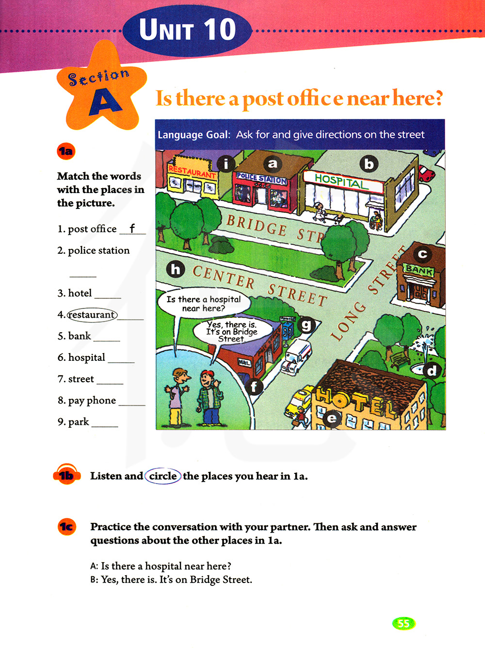 听录音,在1a中圈出所听到的地方。与同伴练习对话。然后,与同伴就1a中的其他地方进行问答。