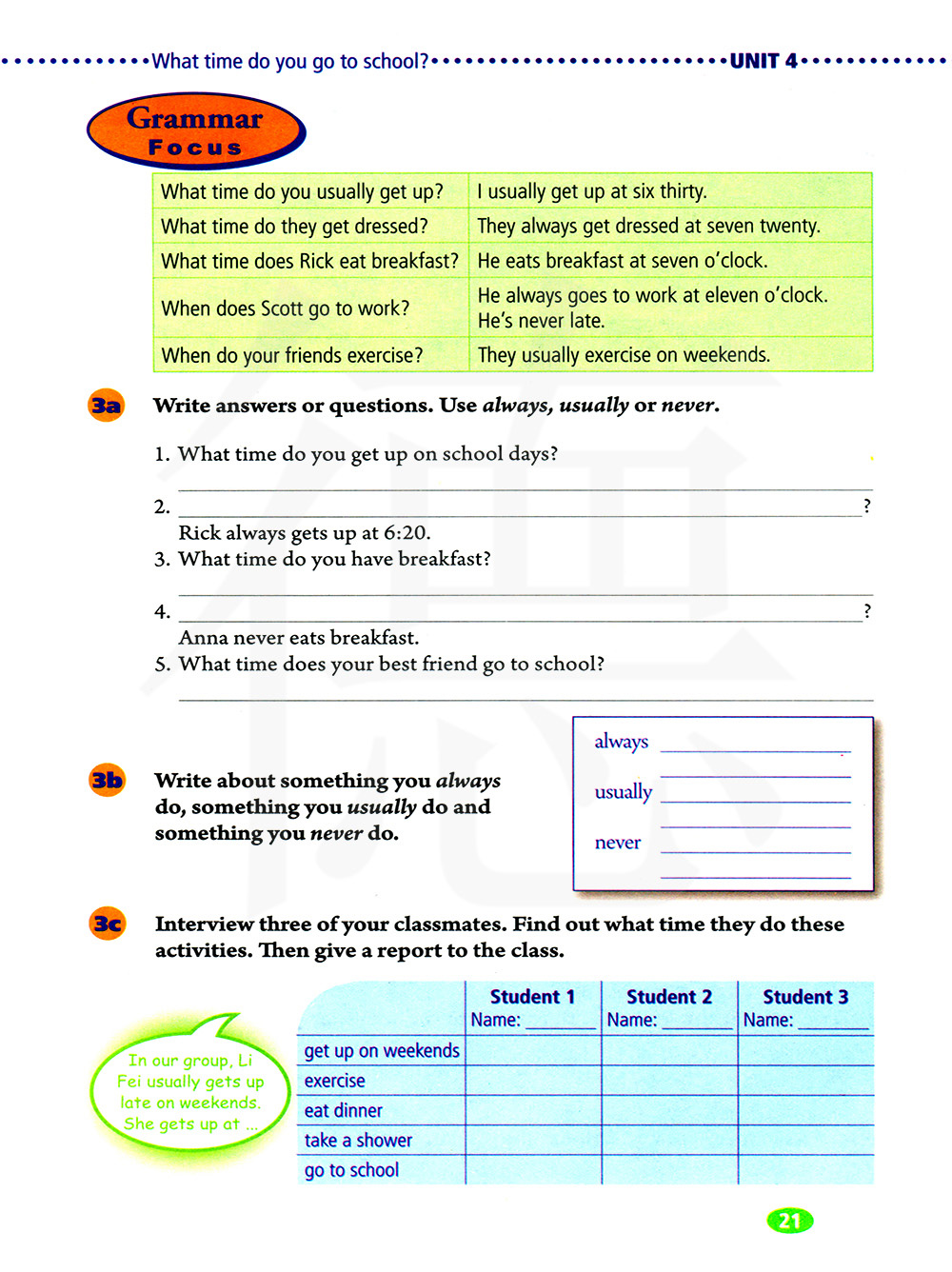斯科特什么时候去上班?他总是十一点去上班。他从未迟到。你的朋友什么时候锻炼身体?他们通常在周末锻炼身体。